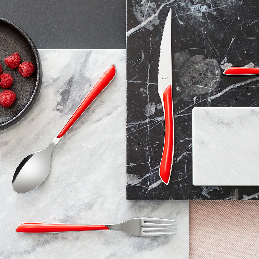 FRESH UP für deinen Esstisch – frische Farben machen gute Laune. Das farbenfrohe Besteck Eclat passt zu allen Mahlzeiten, ob Frühstück, Mittagessen, Kaffee & Kuchen oder Abendessen - für Dich, deine Freunde und Familie.Das Modell Eclat ist ein Benchmark unter den farbigen Bestecken. Dieser Erfolg erklärt sich durch die Qualität der Herstellung und die Originalität des Designs. Seine klaren Linien machen es zu einem außergewöhnlich charmanten Modell, das auf den ersten Blick erkennbar ist.Die prickelnden Farbtöne mit transparenten Effekten und das markante, ansprechende Design verleihen Eclat seinen außergewöhnlichen Charme. Das Besteck ist spülmaschinenfest.Ideal auch für Grillfeste, Picknicks oder Camping-Besteck. Kräftige oder helle Farben, warme oder natürliche Töne: Entscheide selber welche Farbe zu dir und deiner Einrichtung passt oder kombiniere farbenfroh die einzelnen Besteckteile miteinander.Eclat verleiht deinem Esstisch ein frisches, farbiges Ambiente. Ob Himbeerrot, Salbeigrün oder Senfgelb - wähle aus 9 brillanten Farbtönen die passende Farbe zu deiner Einrichtung, deinem Geschirr oder deiner Stimmung.