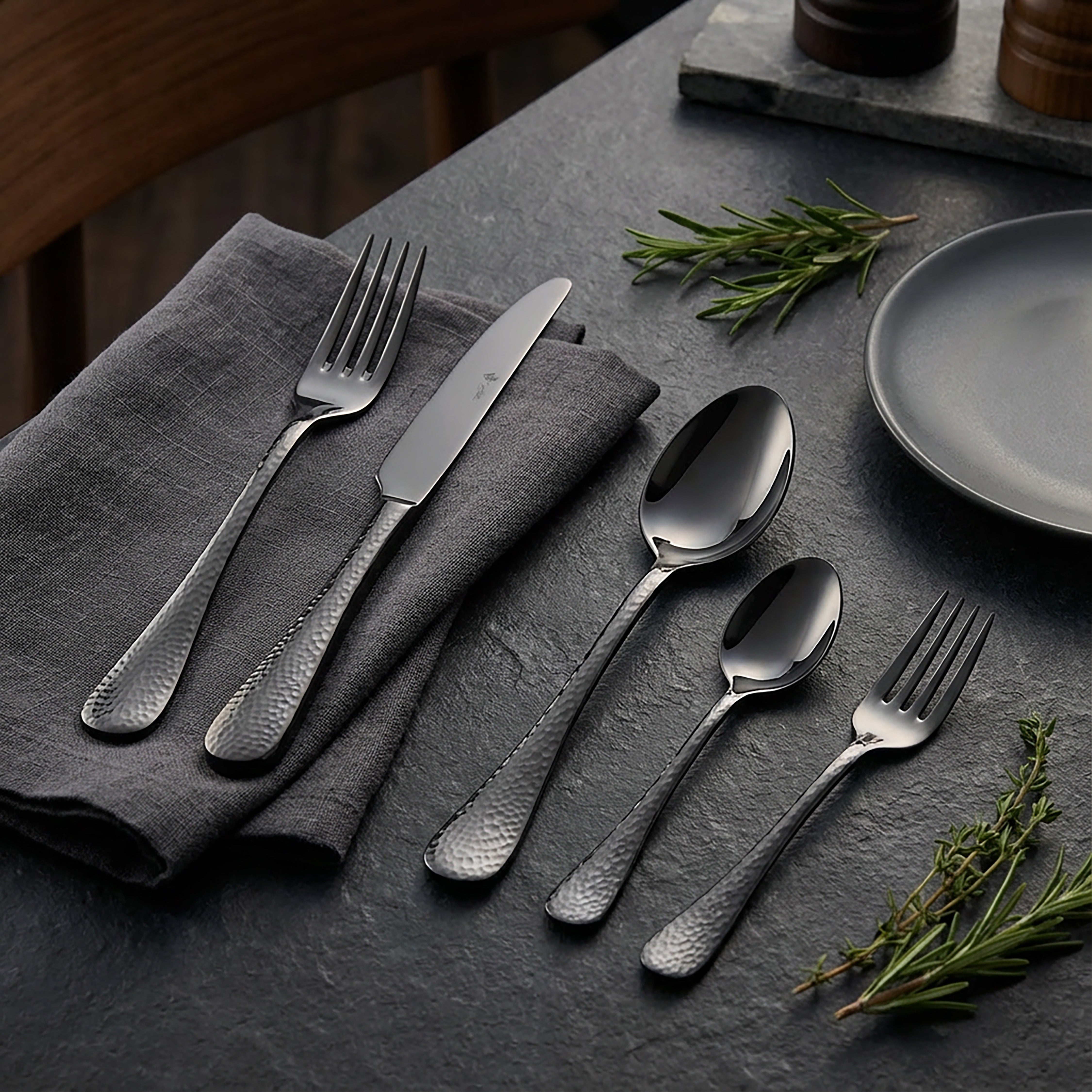 Das Besteckset Mondo im eleganten Hammerschlag-Design mit PVD-Veredelung in schwarz vereint außergewöhnlichen Stil mit harmonisch anspruchsvollem Charme. Die glänzende Oberfläche und die elegant gehämmerten Griffe der Besteckserie Mondo schaffen eine moderne und ansprechende Symbiose. Optisch und haptisch perfekt ausbalanciert, besticht dieses Besteck durch klare Konturen und anmutige Proportionen.