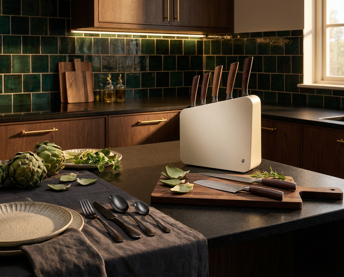 Hochwertige Materialien und präzise Verarbeitung sorgen für dauerhafte Schärfe und eine Qualität, die im täglichen Einsatz überzeugt. Jedes Messer verbindet funktionale Perfektion mit zeitlosem Design und fügt sich harmonisch in jede Küche ein.