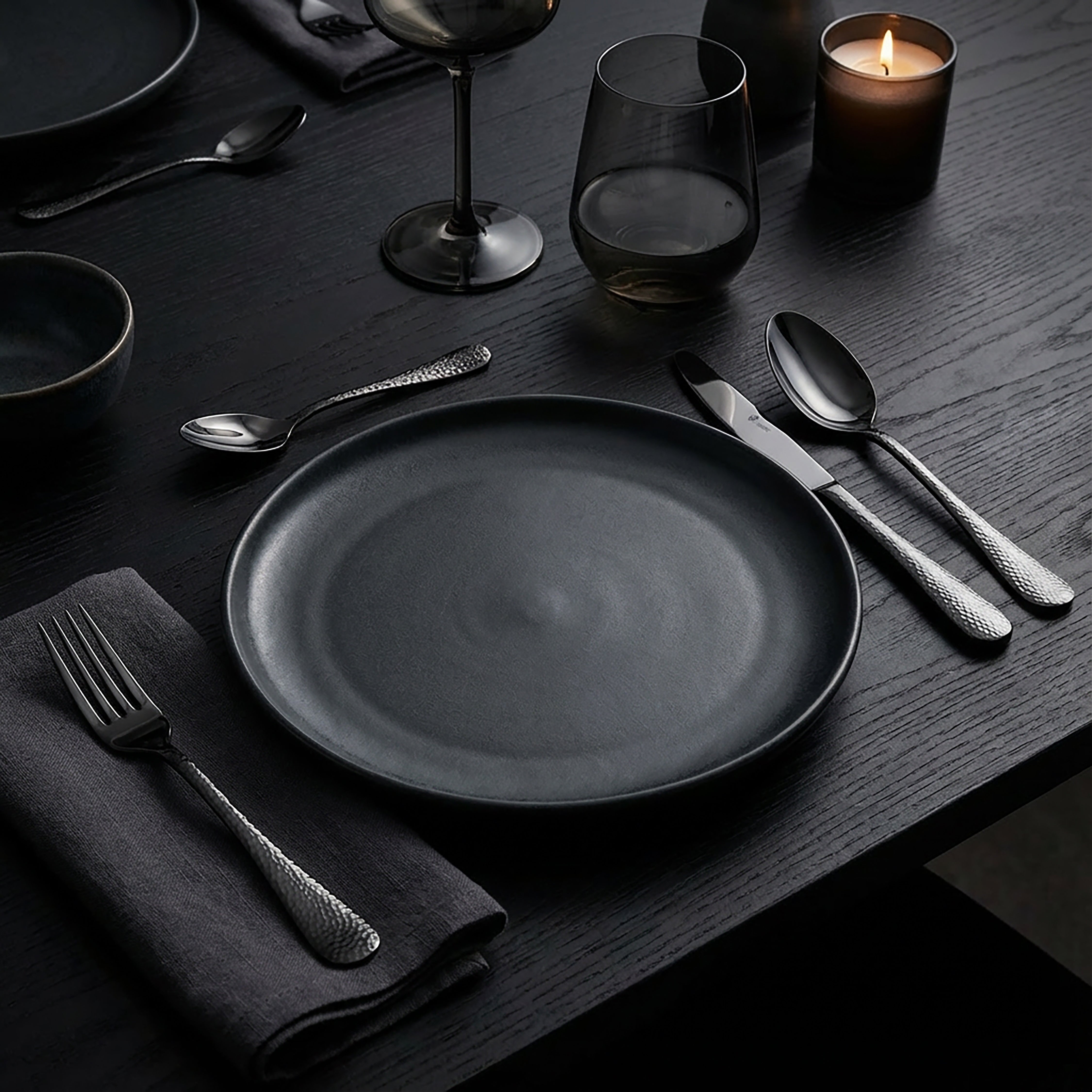 Das Besteckset Mondo im eleganten Hammerschlag-Design mit PVD-Veredelung in schwarz vereint außergewöhnlichen Stil mit harmonisch anspruchsvollem Charme. Die glänzende Oberfläche und die elegant gehämmerten Griffe der Besteckserie Mondo schaffen eine moderne und ansprechende Symbiose. Optisch und haptisch perfekt ausbalanciert, besticht dieses Besteck durch klare Konturen und anmutige Proportionen.